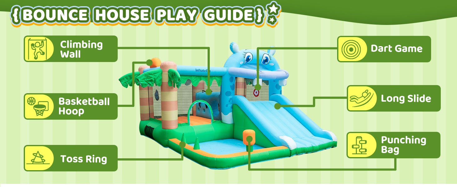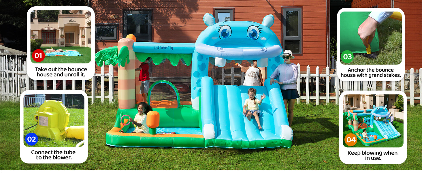 - Inspired by adorable hippos, this bounce house boasts impressive dimensions of 410x370x250cm /161.4x145.7x98.4 in, offering a spacious play area for endless fun.