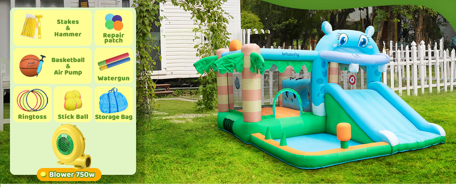 - Includes a powerful 450W air blower, repair patches, manual, 7 bounce stakes, small basketball, pump, and 4 sets of hoops