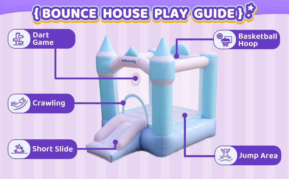 - Features a thrilling slide, interactive basketball hoop, and fun sticky ball game