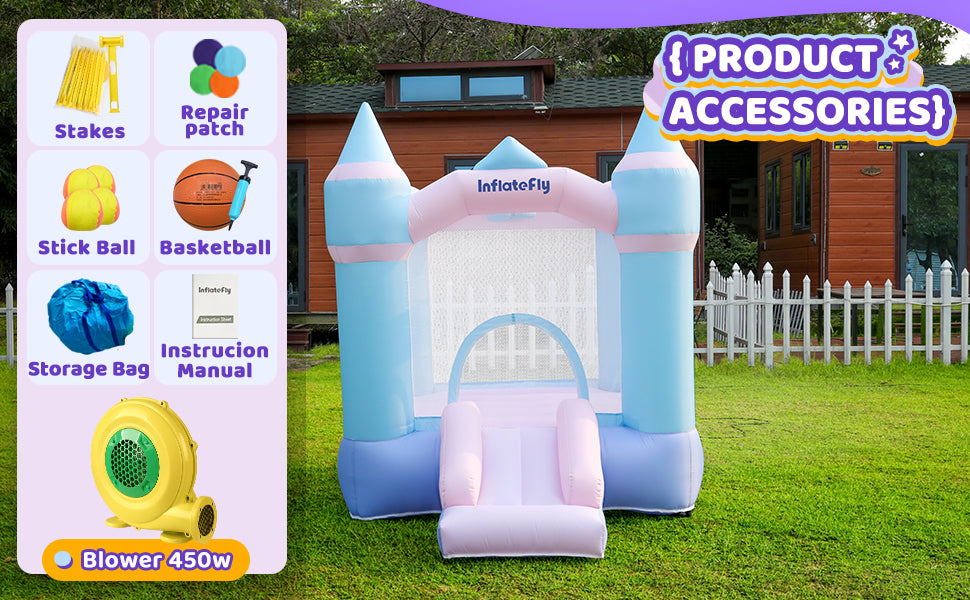 - Includes repair kits with assorted patches, bouncer stakes, air blower, manual, small basketball, pump, and portable carrying bag for transportation convenience