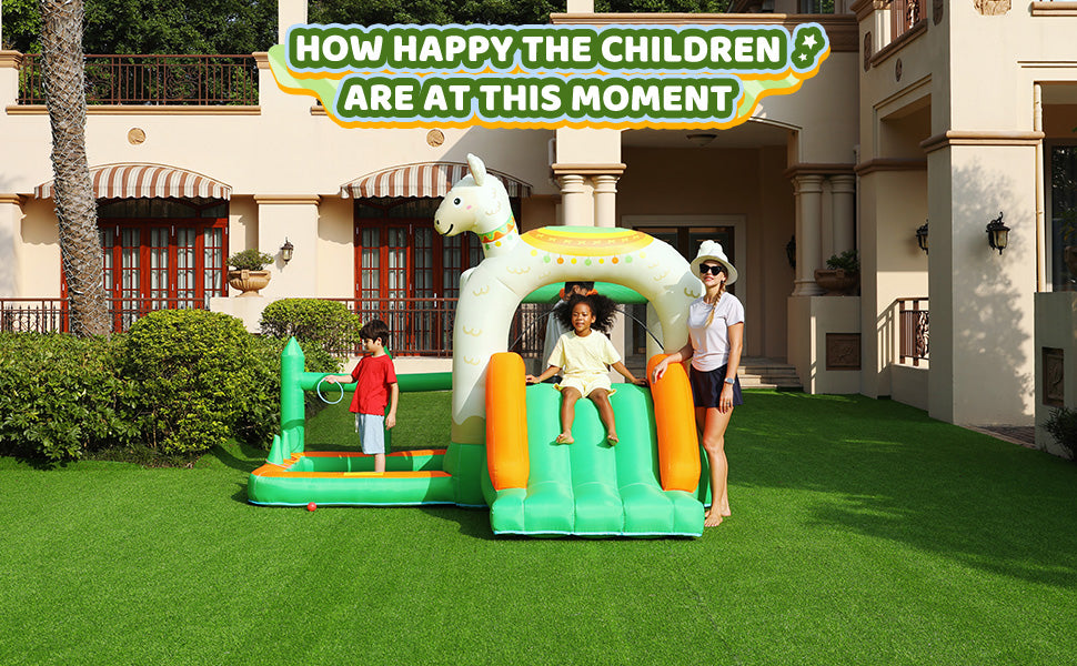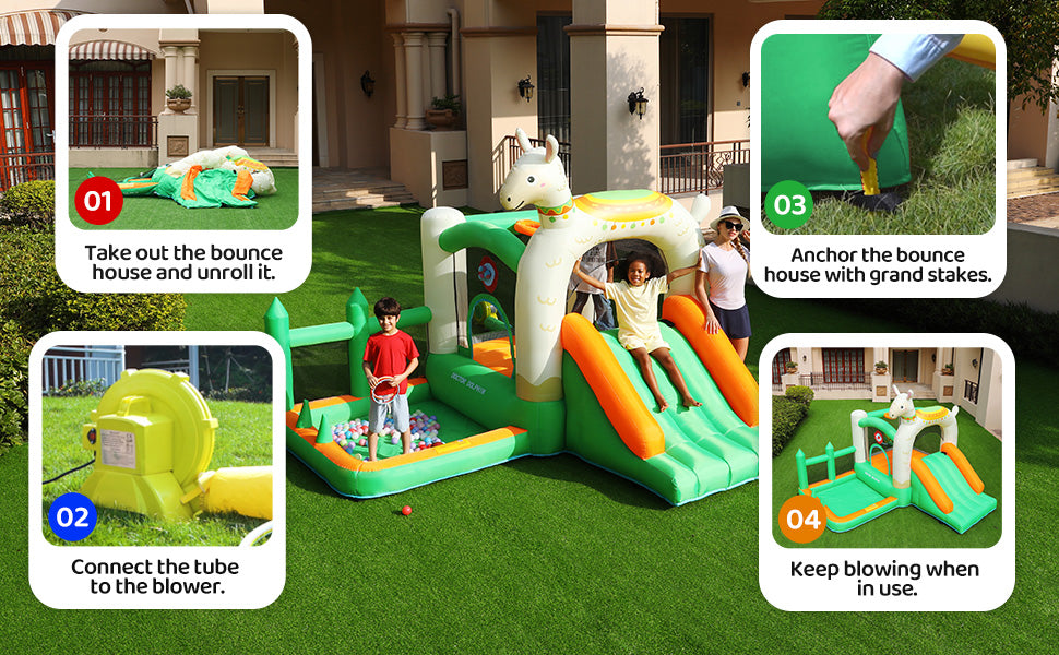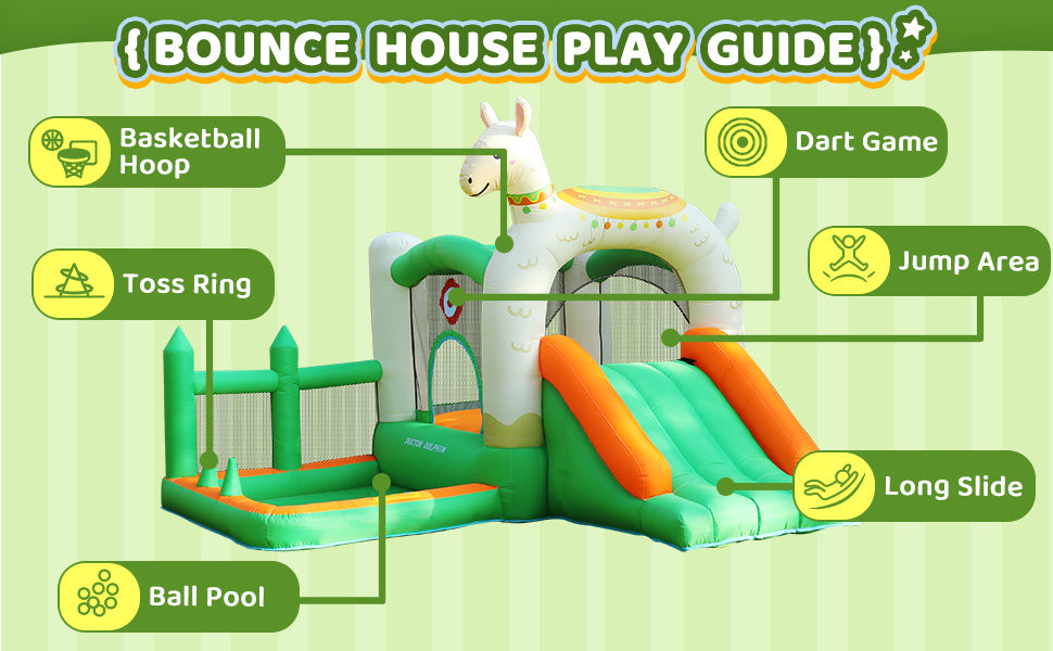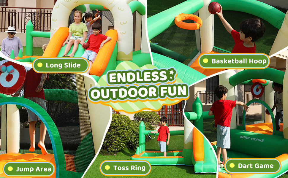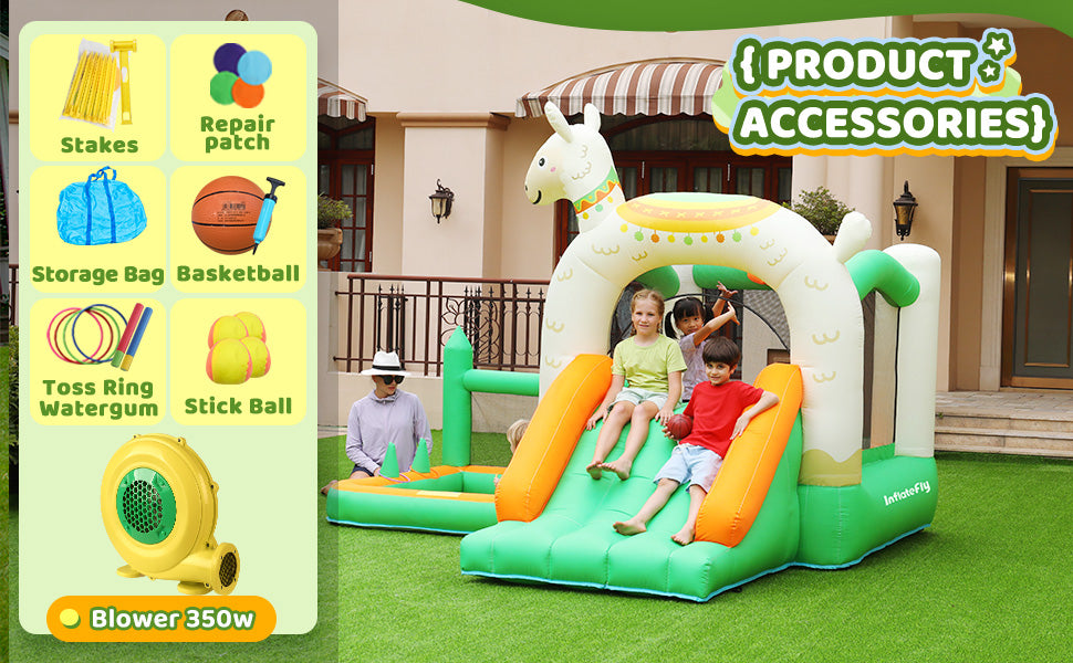 - Includes a 350W blower, carrying bag, mini basketball, manual pump, toss rings, sticky balls, repair patches, manual, glue mallet, and ground stakes