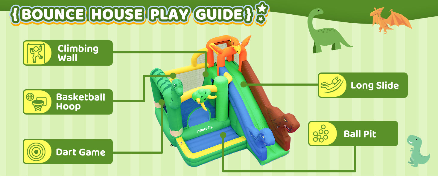 Features bouncing, sliding down the giant slide, climbing the rugged wall, shooting hoops, diving into the ball pool, and aiming at the sticky ball target