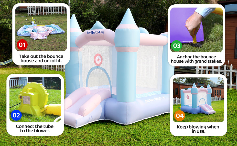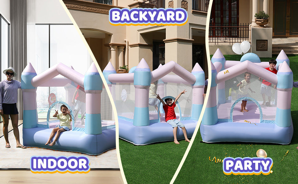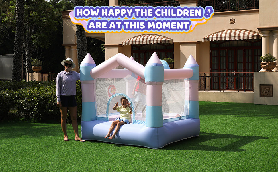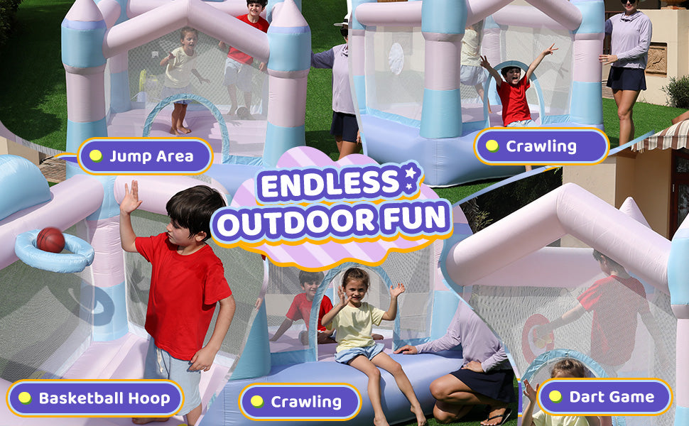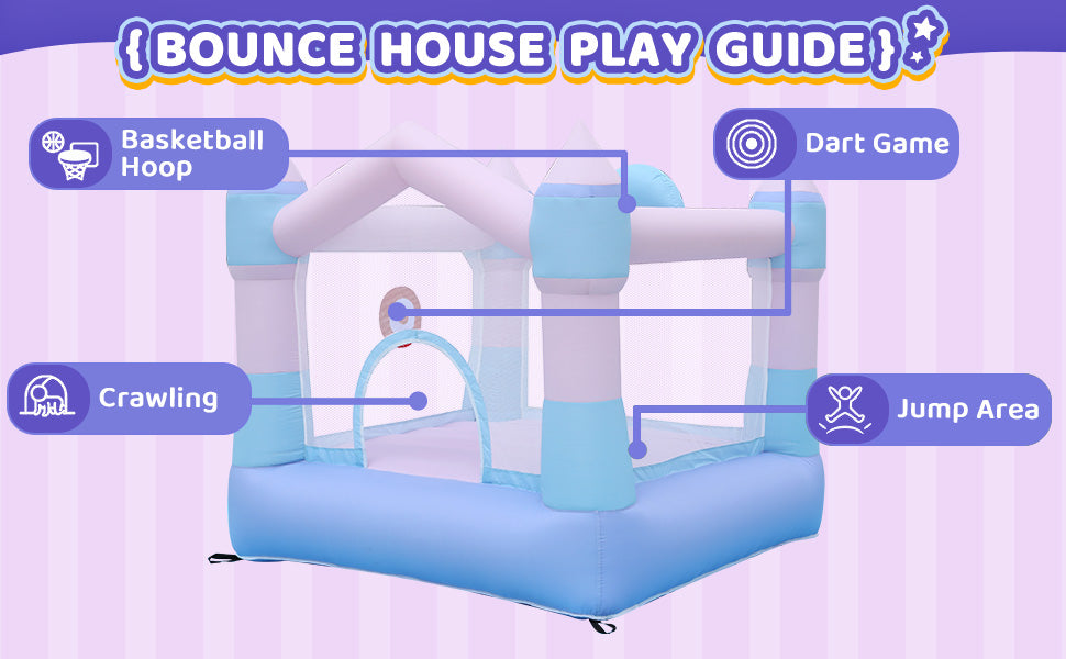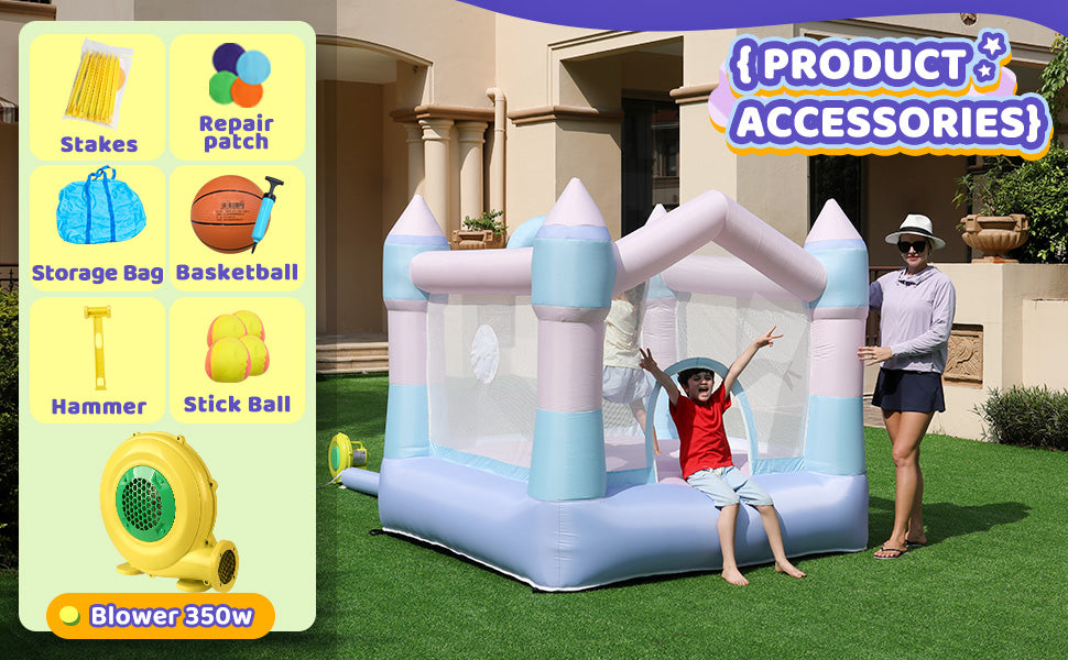 - Includes the bounce house, a robust 350W air blower, repair patches, bounce stakes, a petite basketball, a pump, and a transport-friendly carry bag