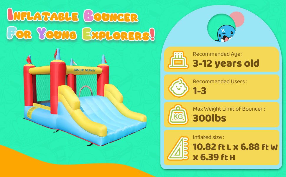The inflatable bounce house measures approximately 130 x 83 x 77 inches when fully inflated, comfortably accommodating up to 3 children at once. Designed for kids aged 2-12, it offers a safe and enjoyable space for play.