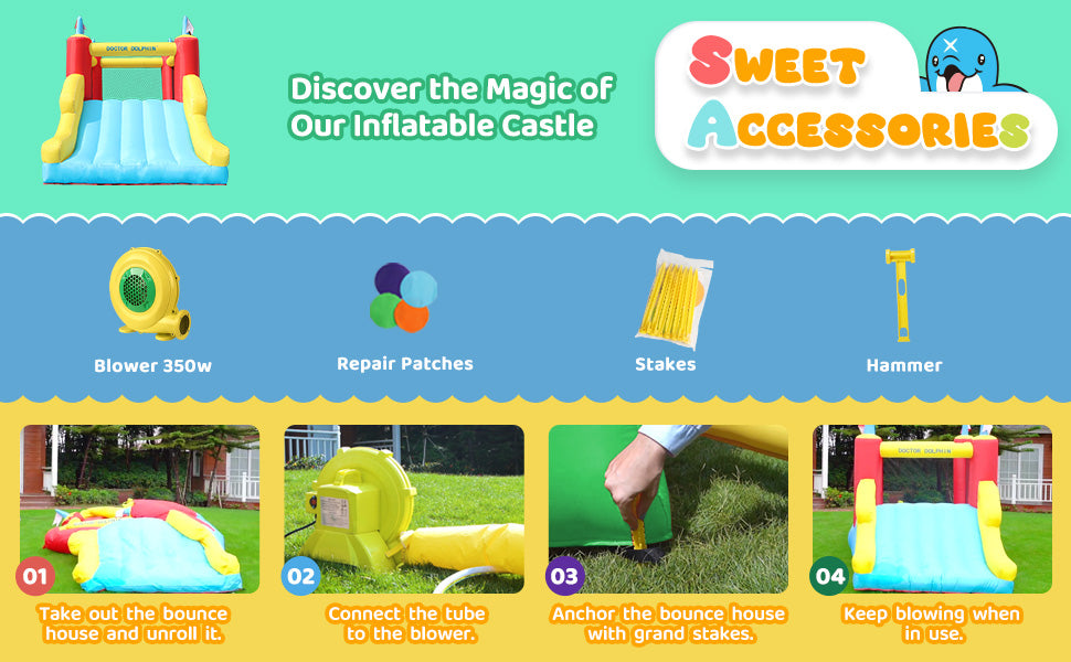 Setup is a breeze—simply turn on the blower, and the bounce house inflates in less than 30 seconds. The blower must run continuously while in use. When it’s time to pack up, deflation is just as easy—fold it up and store it in the included bag. If the bounce house gets dirty, it can be washed, dried, and stored for future use.