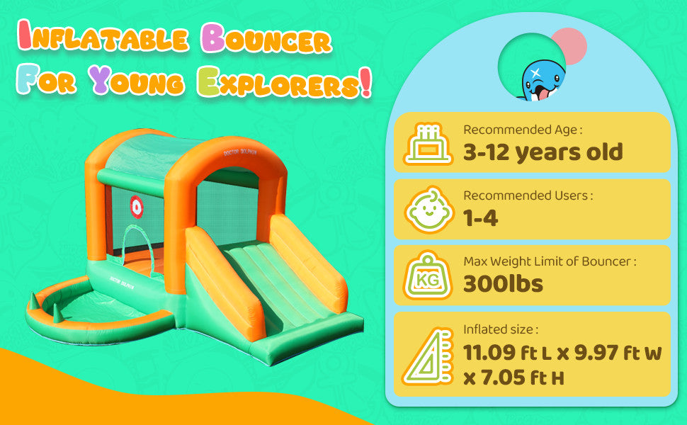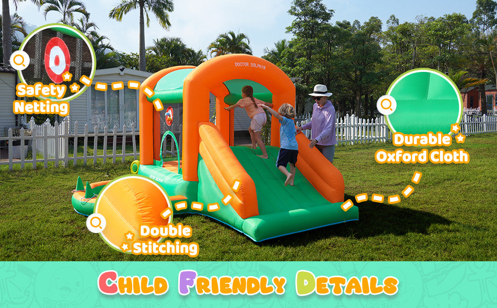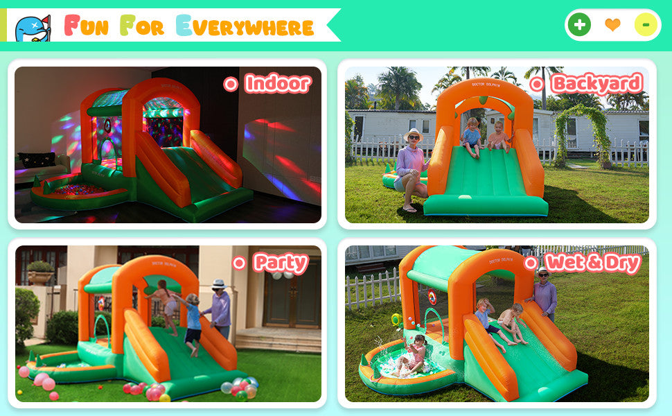 Slide: The bouncy house comes with an inflatable toddler slide, suitable for use by 2 toddlers at the same time. The slide can be wet to transform it into a water slide or pool slide.