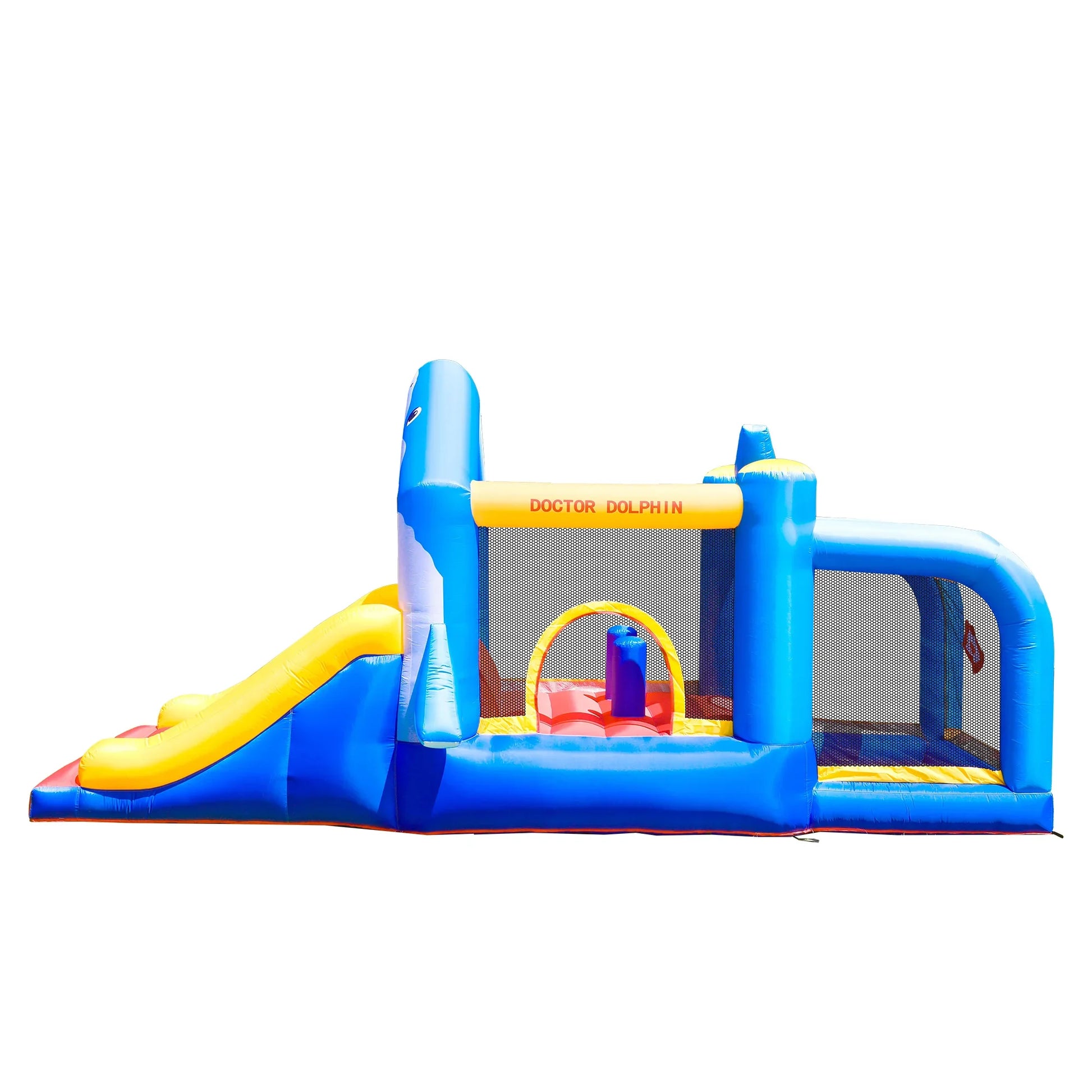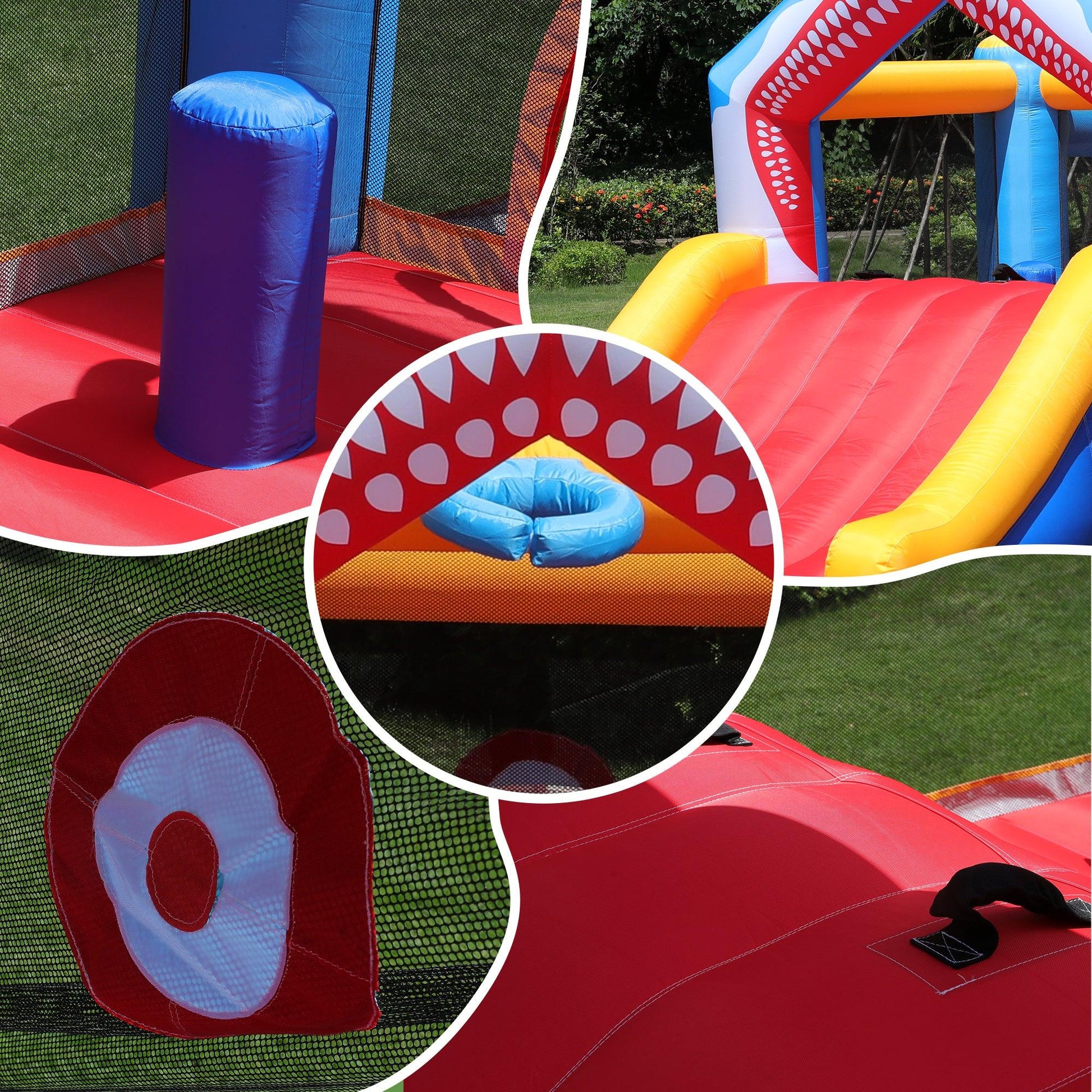 The jump house is surrounded by a three-sided mesh safety net, ensuring your child's safety while they bounce and play. Air leakage holes are intentionally designed to prevent over-inflation and maintain the product's structural integrity.
