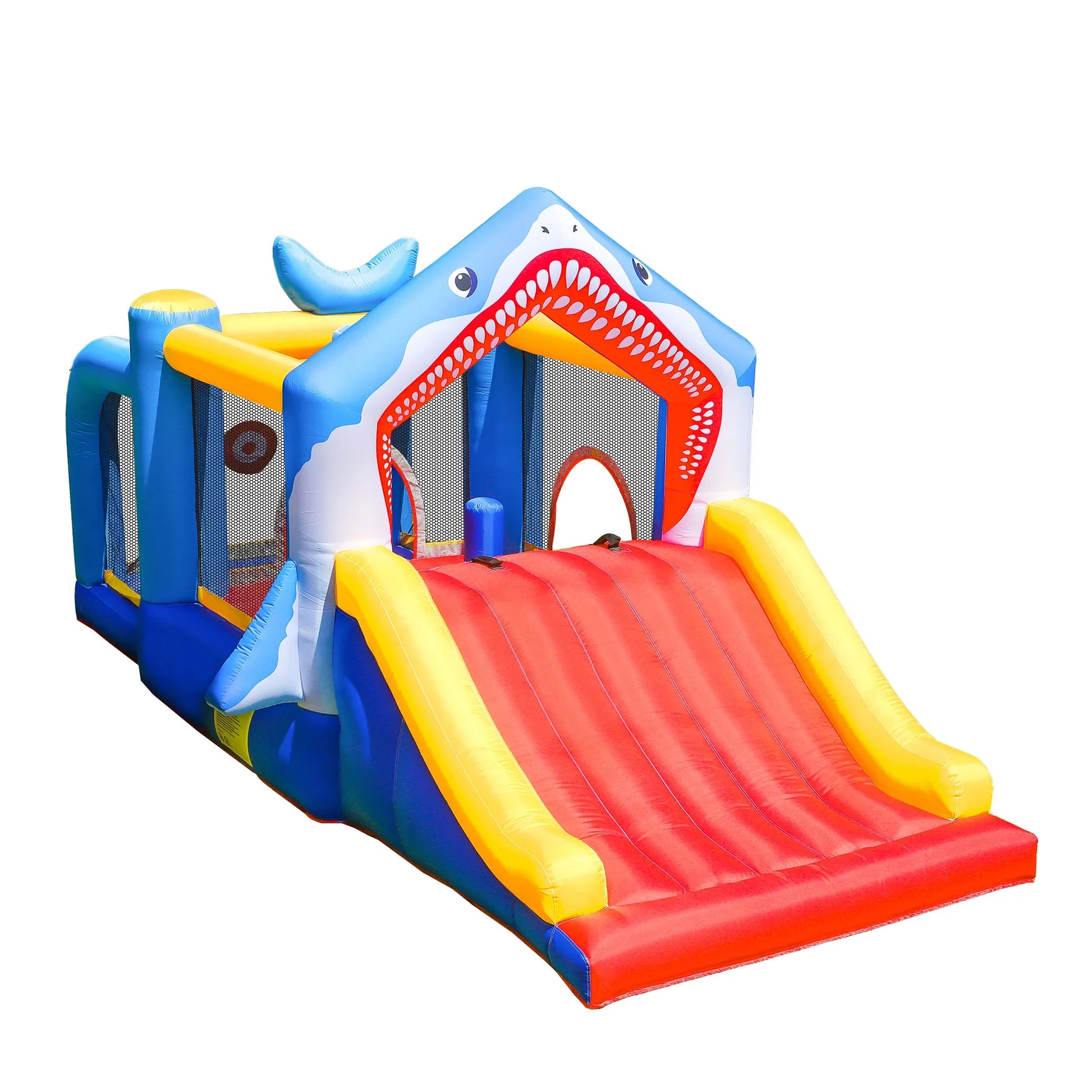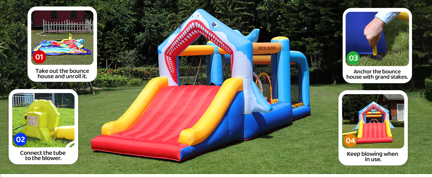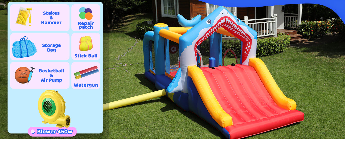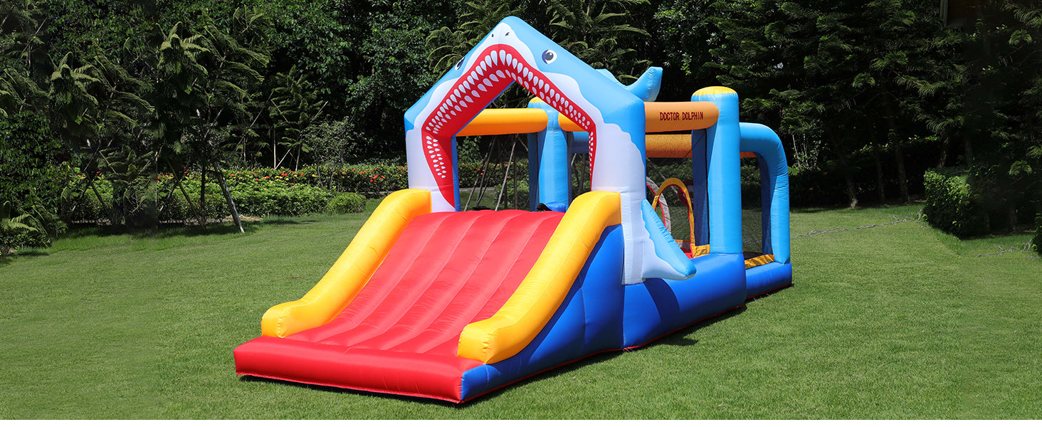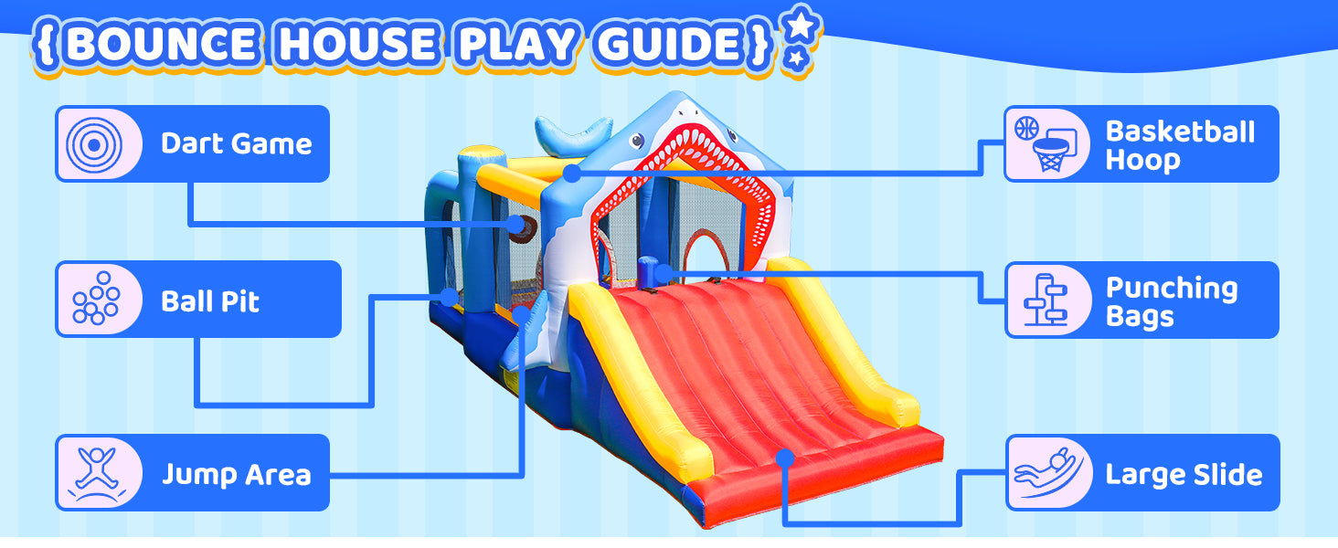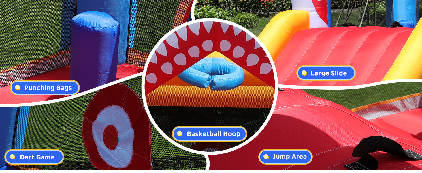 The Shark Adventure Bounce House measures an impressive 180.3 x 97.2 x 84.6 inches, offering plenty of room for active play. With a large slide, it allows 3-5 kids to slip and slide simultaneously, ensuring endless fun.