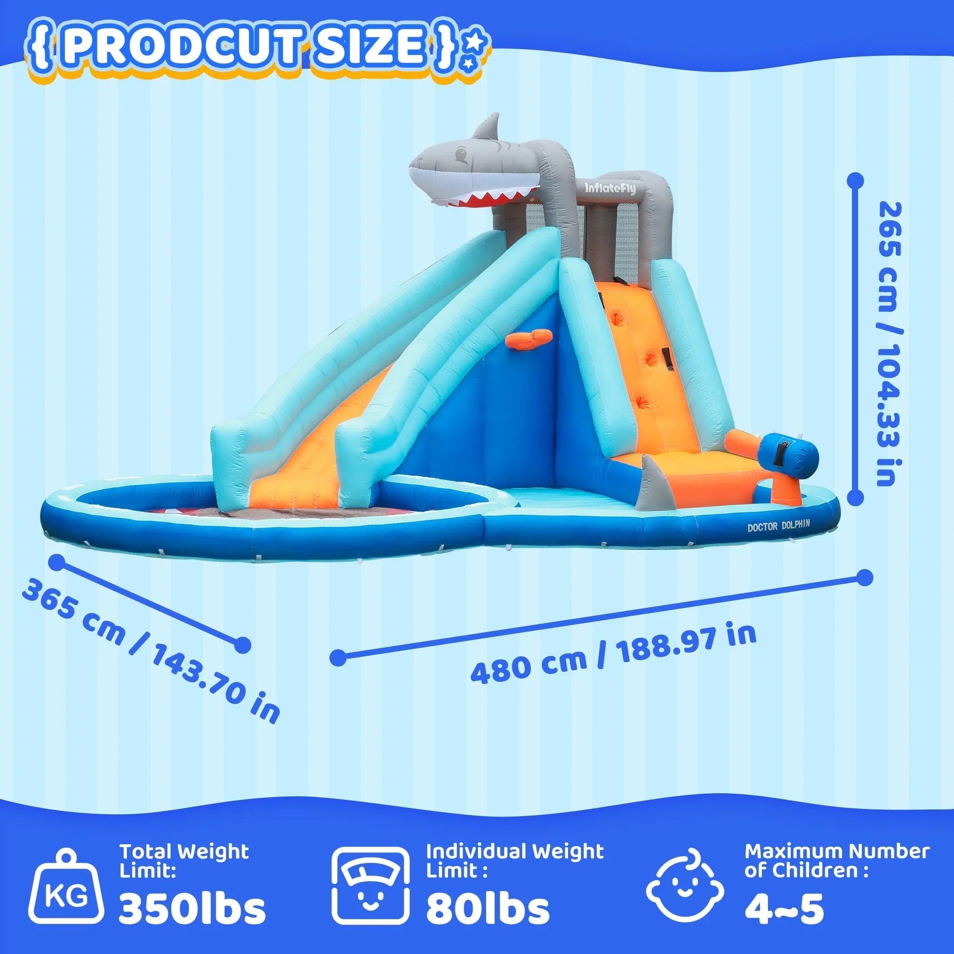 - The water slide measures 188.97"L x 143.7"W x 104.33"H, designed to accommodate 2 to 5 children with a total weight capacity of 350 pounds (maximum of 80 pounds per child).